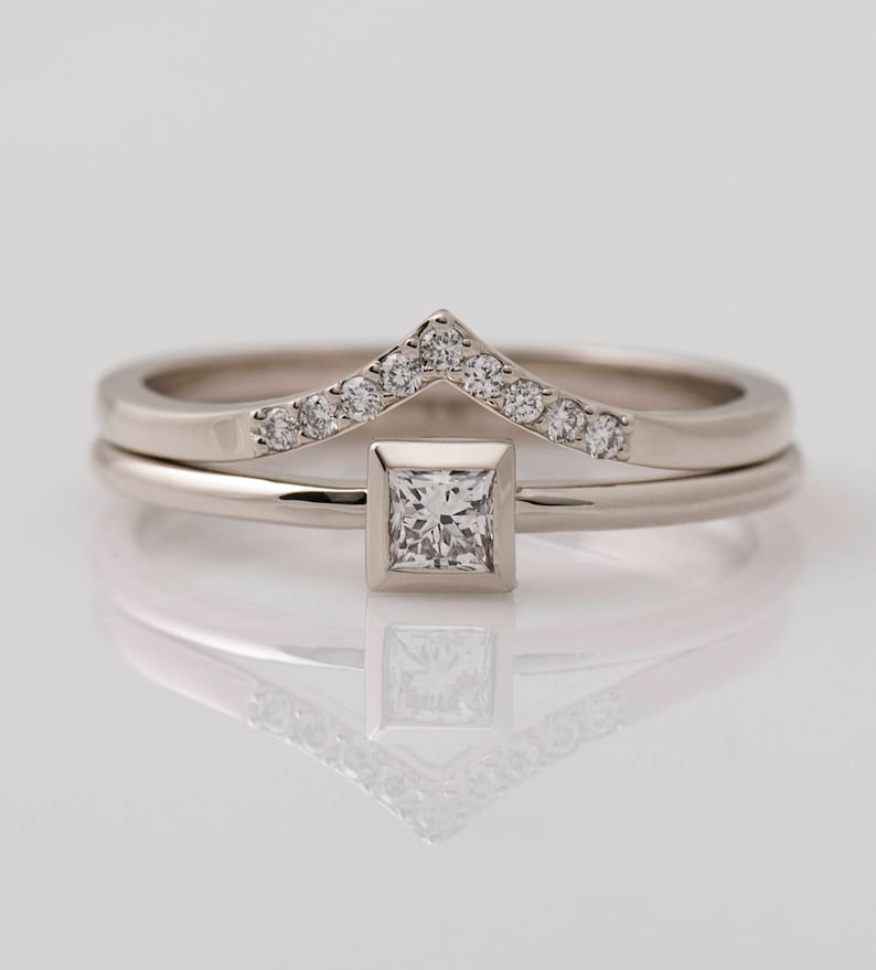 Square Diamond Set 14k 18k White Gold Rings Set Dainty Engagement Ring Wedding Rings Set Princess Diamond Solitaire V Sahpe Ring