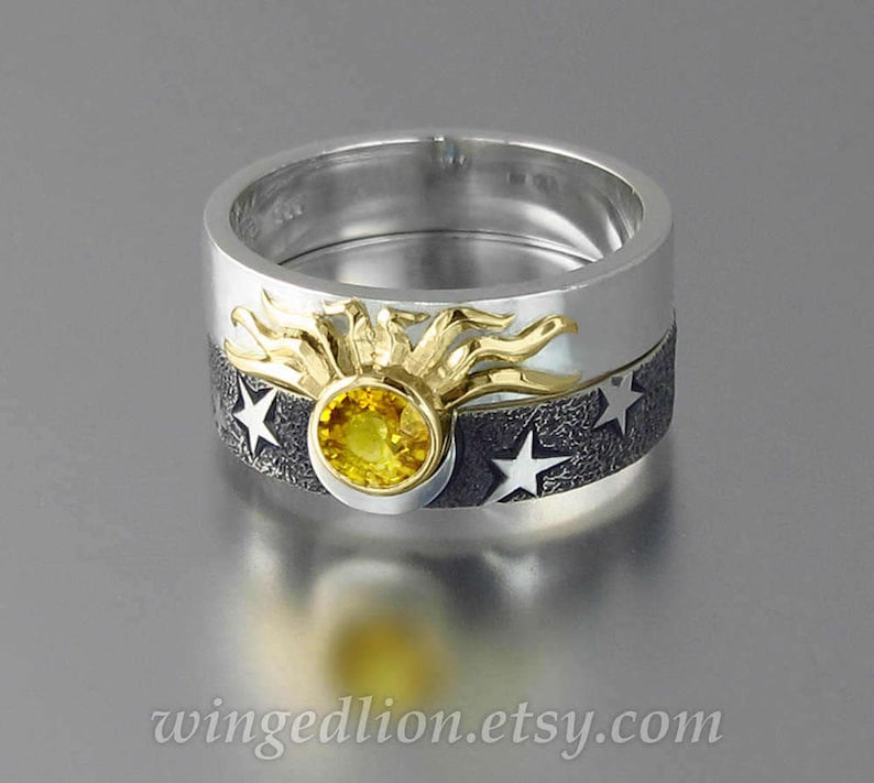 Sun And Moon Eclipse Engagement Ring Wedding Band Set In 18k Gold And Silver With Yellow Sapphire