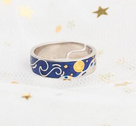 S925 Silver Glitter Rings Van Gogh S Enamel Couple Rings Sky Star Moon Sun Engagement Ring Women Night Thinking Wedding Jewelry