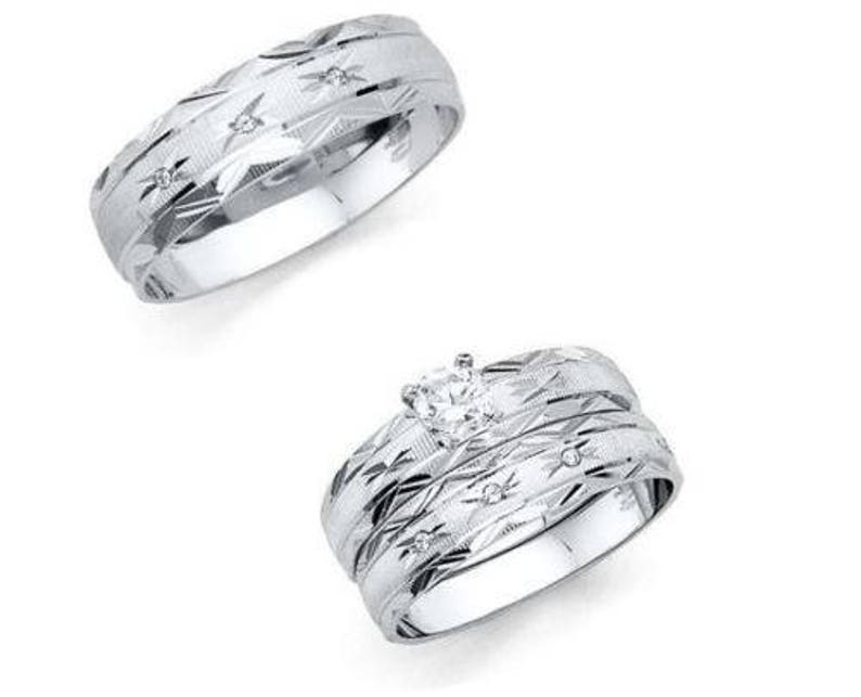 0 5ct 14k Solid White Gold Round Cut Diamond Engagement Ring Trio Set Wedding Band Set For Men And Women Him And Her Cubic Zirconia