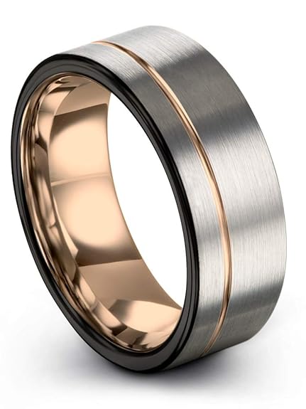 Midnight Rose Collection Tungsten Wedding Band Ring 9mm For Men Women 18k Rose Yellow Gold Plated Flat Cut Off Set Line Black Grey Brushed Polished