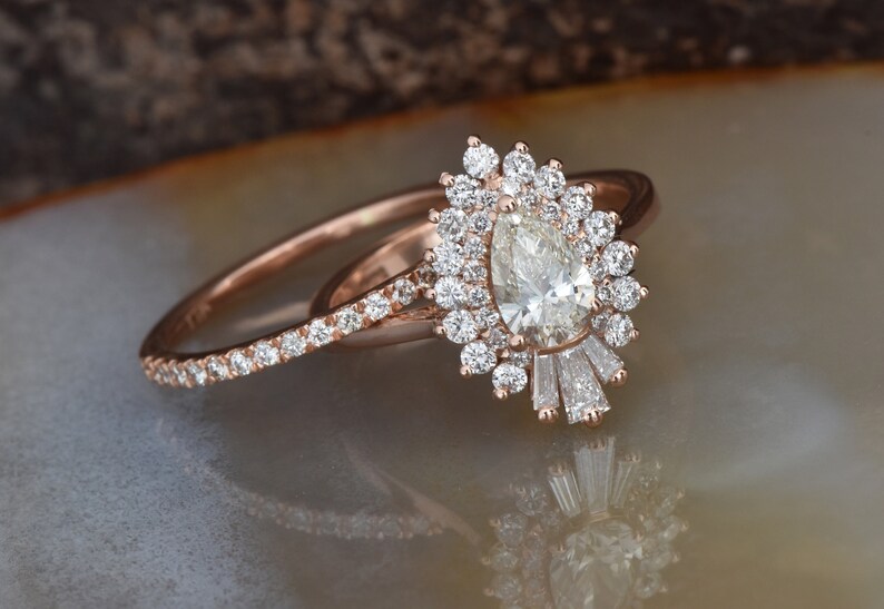 Cluster Wedding Ring Set Baguette Wedding Bands Women Diamond Engagement Ring Vintage Gold Ring Promise Ring Pear Shaped Diamond Ring