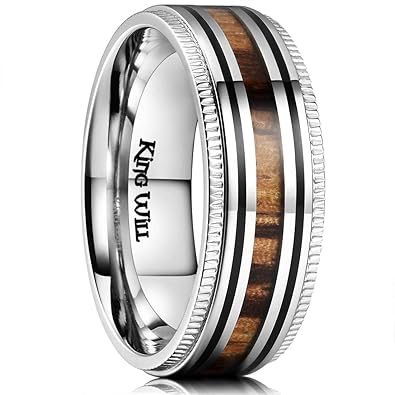 King Will Nature Mens 8mm Stainless Steel Wedding Ring Real Wood