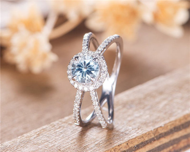 Aquamarine Engagement Ring Rose Gold Halo Diamond Bridal Ring Split Shank Double Band Unique Antique Wedding Ring