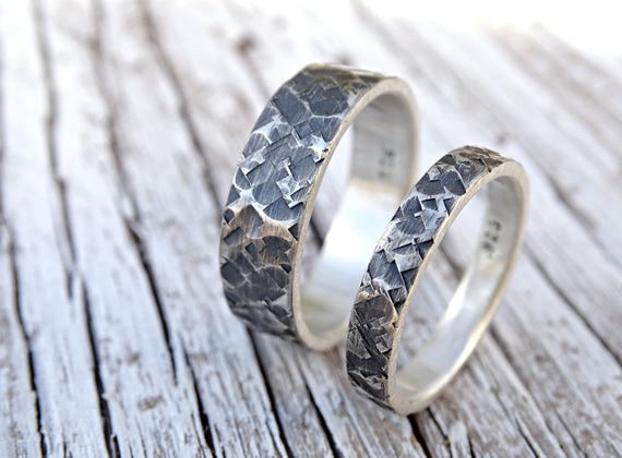 Square Hammered Wedding Band Set Silver Wedding Rings His Her Ring Set Couples Matching Rings Bride Groom Ring Set Bridal Jewelry Set