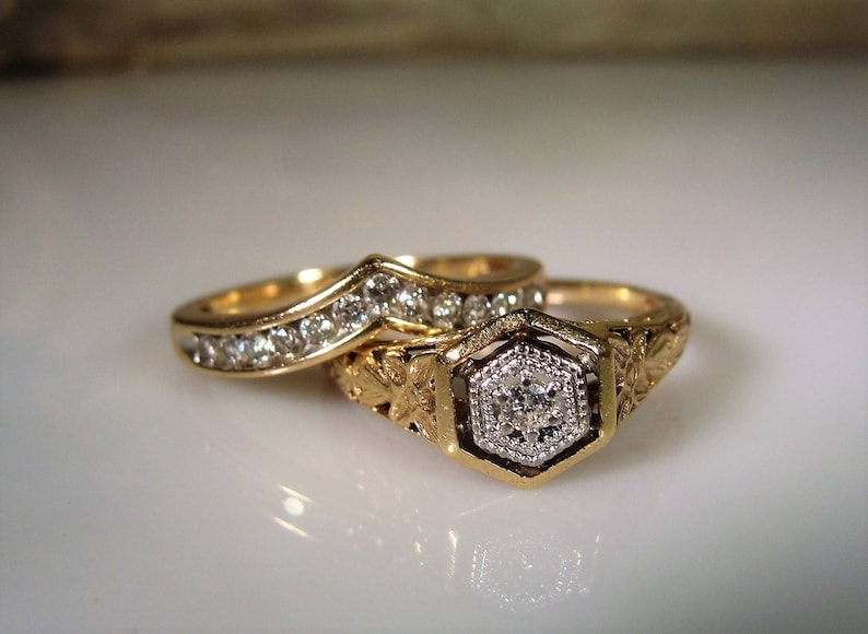 Art Deco Bridal Ring Set Wedding Rings Set 10k Gold Engagement Ring Wedding Band Diamond Engagement Chevron Diamond Vintage Rings S7