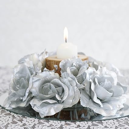 Efavormart 8 Pcs Artificial Roses Flowers Candle Rings For Diy Wedding Centerpieces Party Home Decorations Wholesale Silver
