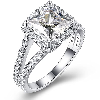 Vibrille 925 Sterling Silver Split Shank Princess Cut Cubic Zirconia Halo Engagement Rings For Women