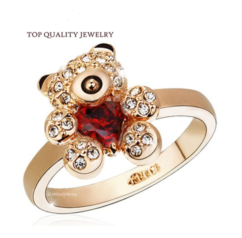 Top Quality Gold Little Bear Red Crystal Ring Rose Gold Color Austrian Crystals Full Sizes Wholesale Free Shipping