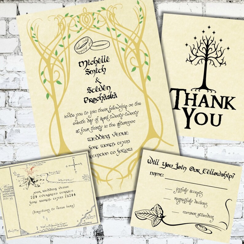 Lord Of The Rings Wedding Invitation Set Invite Custom Printable Hobbit Elven Elvish Tolkien Lotr Thank You Map Directions Rsvp Postcard