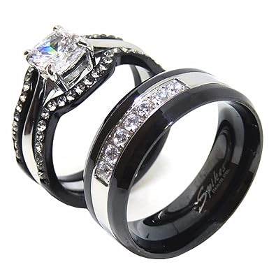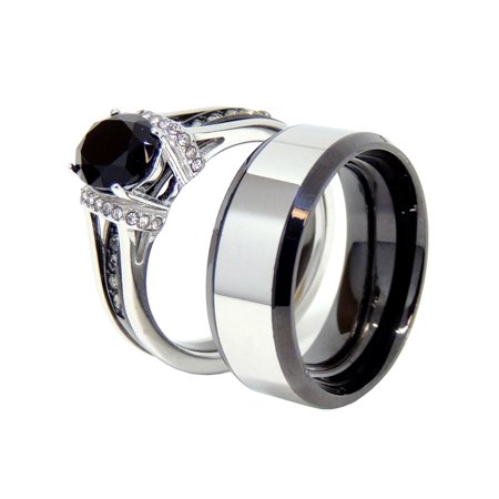 Lanyjewelry His Hers Couples Ring Set Womens Black Stainless Steel Promise Ring Mens 7 Cz Wedding Band