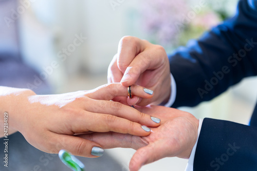 Groom S And Bride S Hands Putting The Wedding Ring During Wedding Ceremony Groom Put A Ring On Finger Of His Lovely Wife Wedding Couple